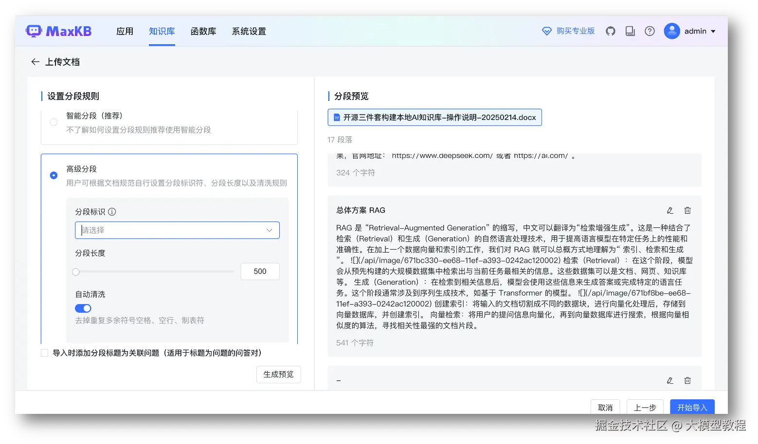 - 支持高级分段:用户可根据文档规范自行设置分段标识符、分段长度及清洗规则;
