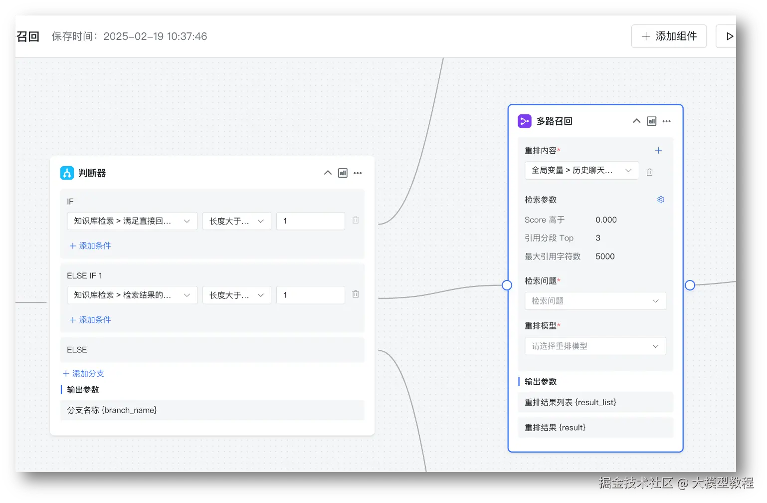 - 支持基于工作流编排添加多路召回节点,通过设置重排内容以及重排模型重新输出重排结果。