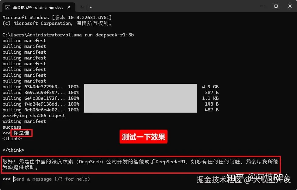 安装完成后,会自动运行大模型,我们输入一个问题测试一下: