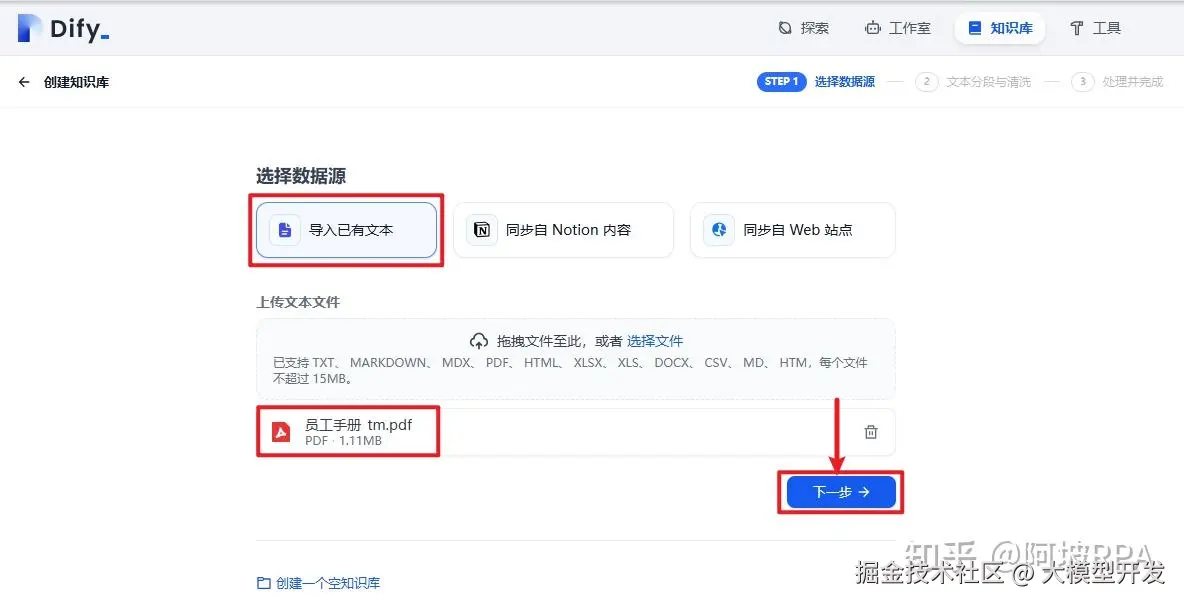 他也支持从已有文本,Notion,网页等数据源创建知识库: