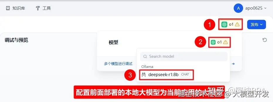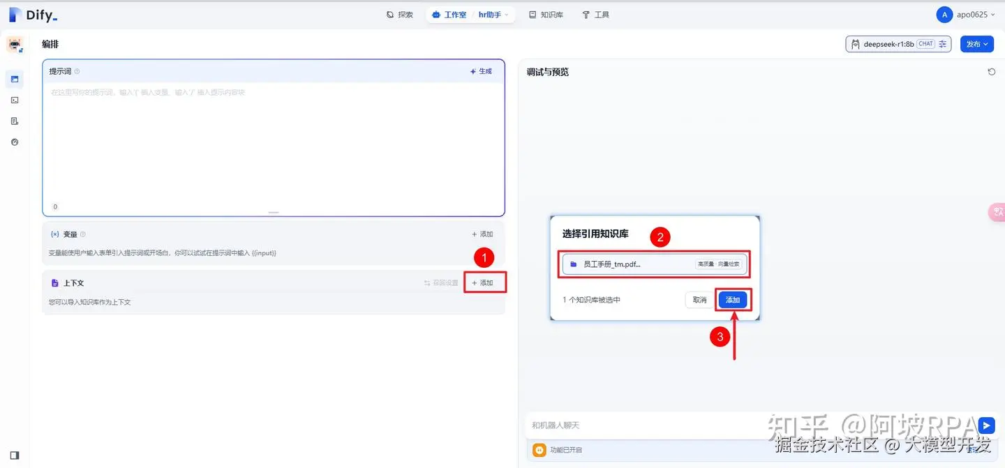 这表明,dify与本地部署的大模型deepseek-r1连通了,但是,我想让他的回答是基于我的私有知识库作为上下文来和我聊天怎么办?这就需要用到本地知识库了