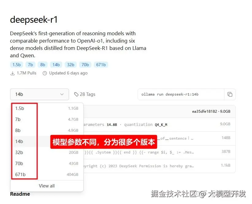 可以看到模型有根据参数分为1.5b,7b,8b,14b,32b,70b,671b等,我们需要根据自己电脑选择下载对应参数的模型。