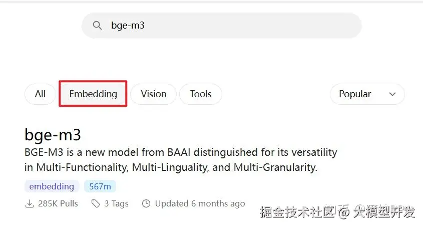 BGE (BAAI General Embedding) 专注于检索增强llm领域,经本人测试,对中文场景支持效果更好,当然也有很多其他embedding模型可供选择,可以根据自己的场景,在ollama上搜索“embedding”查询适合自己的嵌入模型。