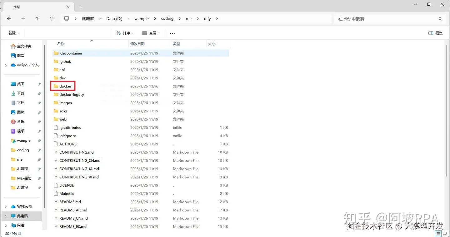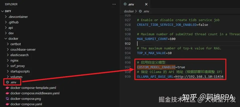 找到dify项目下的docker文件夹并进入,前面已经将.env.example改为了.env文件了,在末尾填上以下配置: