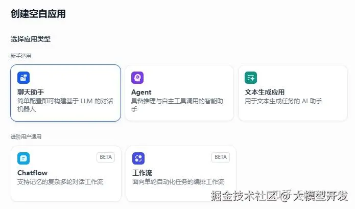 从创建应用页面可以看到,他可以创建:聊天助手,Agent,文生文应用,对话工作流,任务编排工作流等