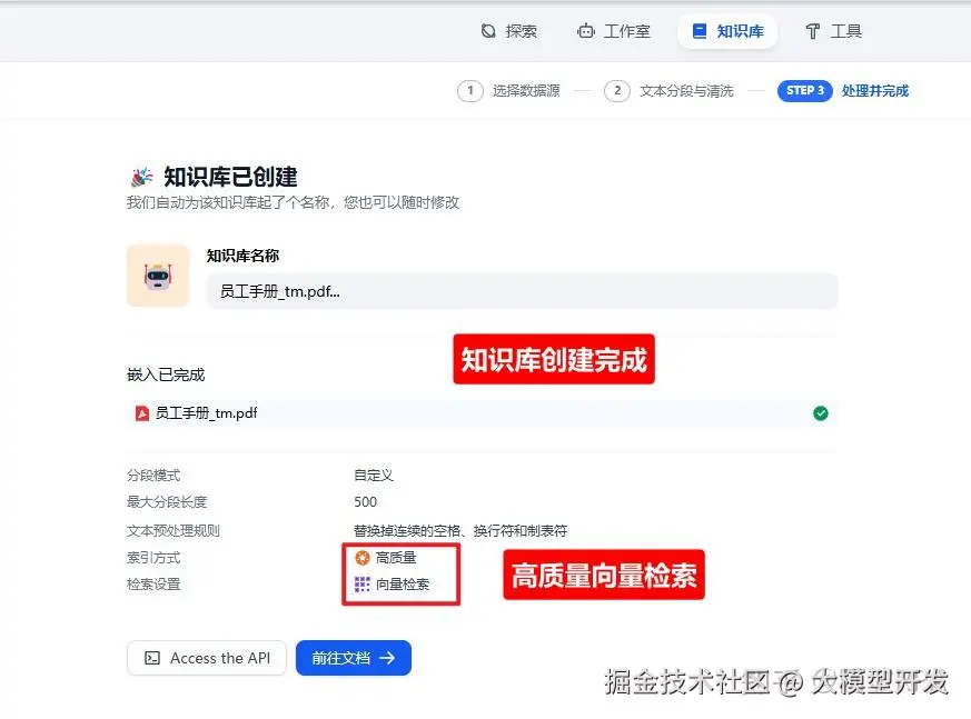 我们上传的资料要通过Embedding模型转换为向量数据存入向量数据库,这样回答问题时,才能根据自然语言,准确获取到原始数据的含义并召回,因此我们需要提前将私有数据向量化入库。