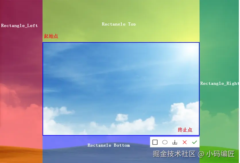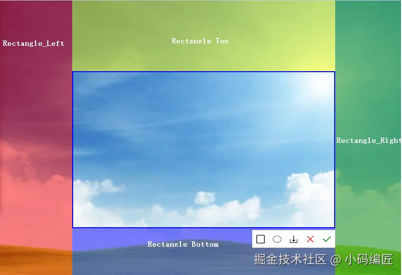 如果所示当鼠标按下移动时可以根据起始点,以及当前点实时绘制Border矩形,同时可计算出Left、Right、Top、Bottom 4个矩形的位置,通过Canvas不断设置各部分的位置,4个矩形的遮挡的地方实现背景虚化,而Border选择区真实显示