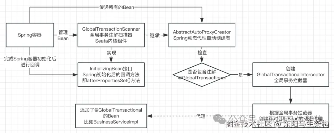 全局事务注解扫描器GlobalTransactionScanner的wrapIfNecessary()方法,发现传入的Bean含有Seata的注解,需要为该Bean创建动态代理时,会调用父类Spring的AbstractAutoProxyCreator的wrapIfNecessary()方法来创建。