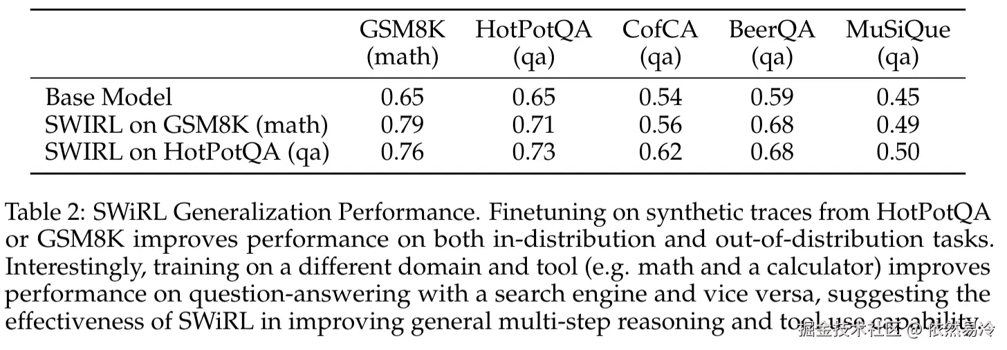 ②【表2】在HotPotQA或GSM8K的合成轨迹上进行SWiRL微调,能提升模型在同分布和不同分布任务上的性能,且在不同领域和工具使用的任务间进行训练,可有效提高模型的通用多步推理和工具使用能力。