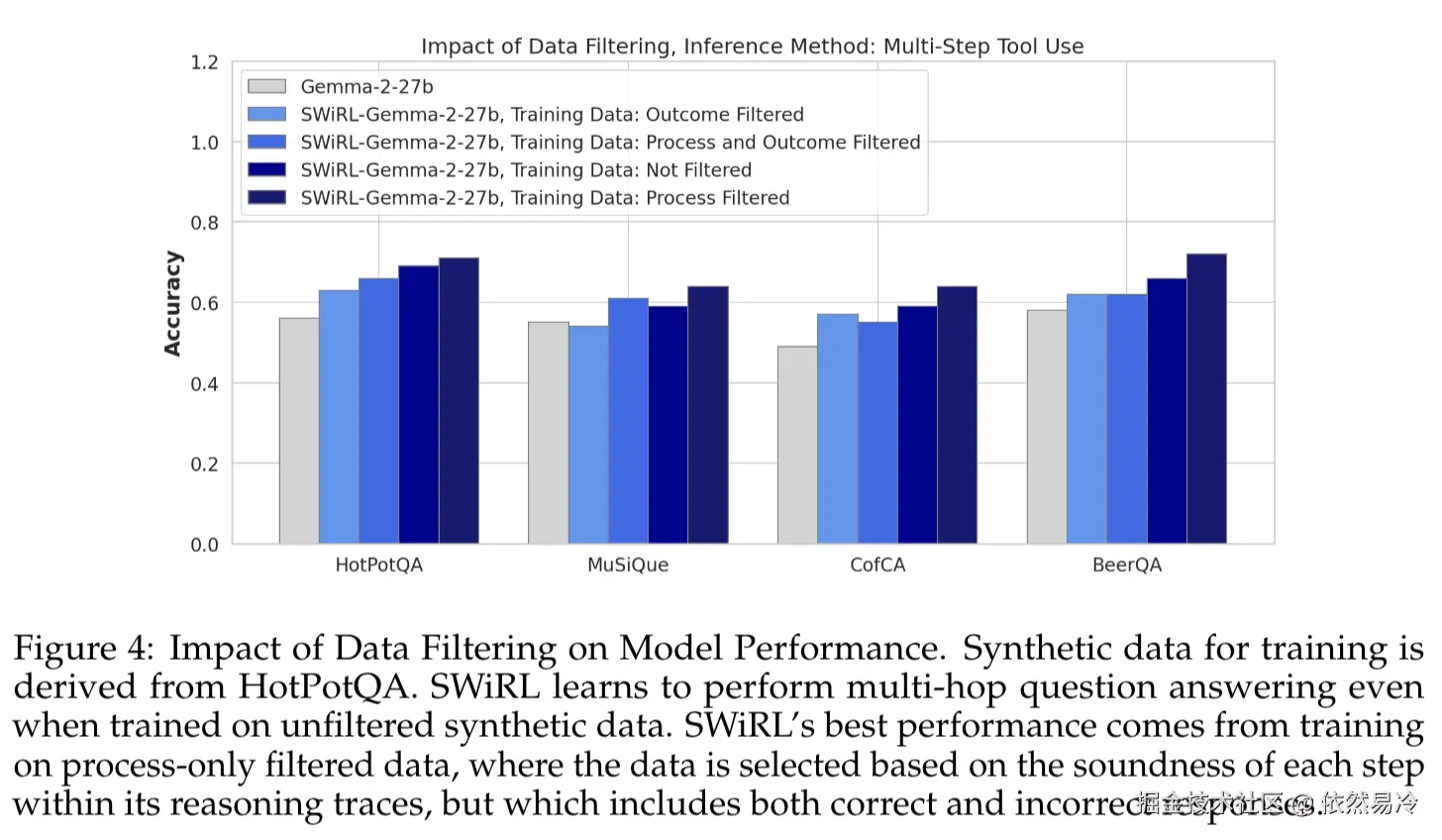 ①【图4】通过对比4种过滤机制对下游任务准确率的影响,发现仅过程过滤普遍带来最高准确率,说明注重数据提炼过程更关键;除MuSiQue外,正确性过滤常降低性能,表明SWiRL能从正负例学习,凸显结果过滤相对不重要,且其过程RL方法可从答案错误轨迹有效学习。