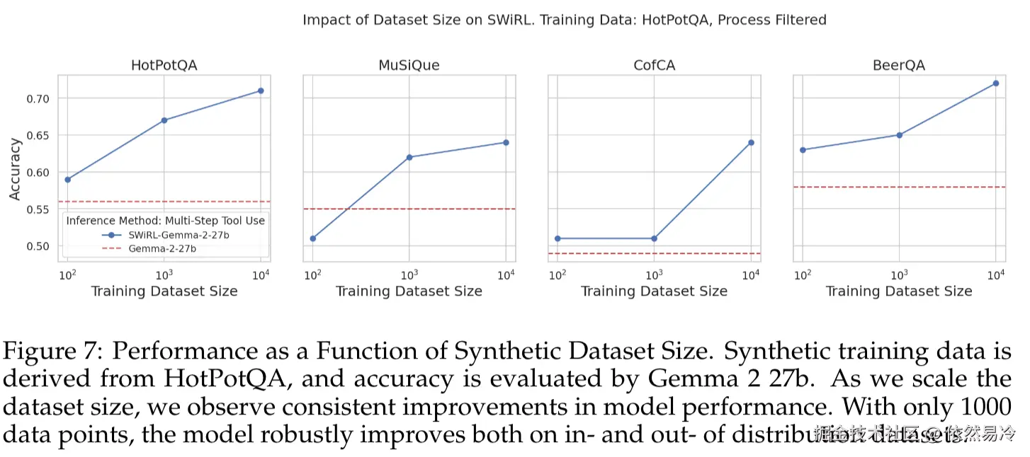 ⑤【图7】随着微调数据集规模增加,SWiRL在多步推理任务上的模型性能持续提升,100个数据点的数据集难以让模型有效泛化,1000个数据点时模型性能显著改善,10000个数据点能进一步提升性能,且较小模型(2b和9b)在领域内受益于SWiRL,但泛化能力不如27b模型。