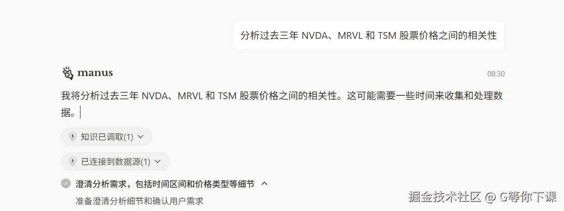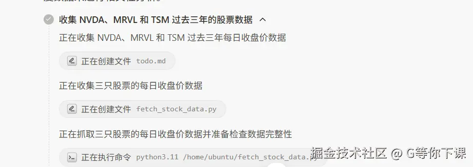 以分析过去三年 NVDA、MRVL 和 TSM 股票价格之间的相关性这一 “烧脑” 任务为例📈,Manus 会迅速列出一套完美的 “作战计划”:它先明确需要获取数据、分析数据、可视化呈现以及撰写报告等关键环节,再根据各环节特性,精心挑选适配的AI助手,让每个任务节点都有专业“选手”负责。