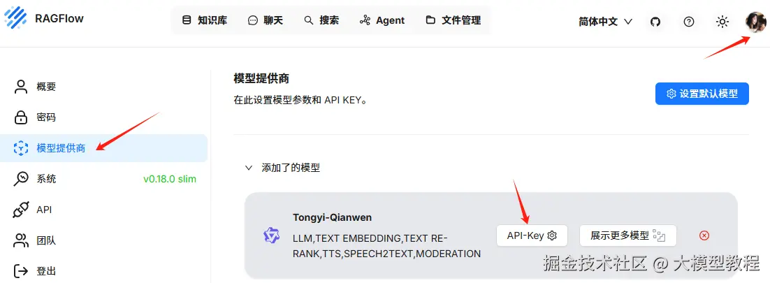 点击右上角头像-->模型提供商,设置通义千问