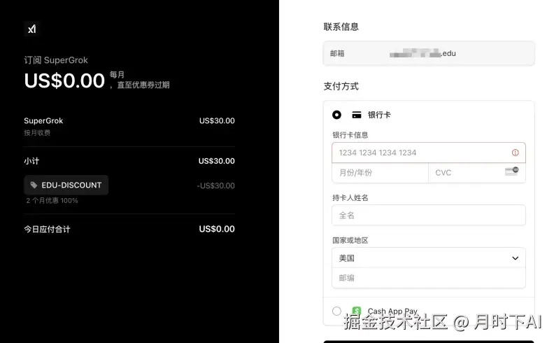 接下来,就可以在 SuperGrok 的订阅页面填写美国 MasterCard 卡号和账单信息。需要注意的是,如果你是拥有有效的教育邮箱(如 .edu 域名),系统会自动识别并应用教育优惠,显示每月费用为 $0.00。