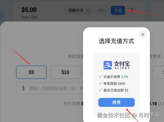 为了顺利完成 SuperGrok 的订阅并享受教育优惠,需要使用支付宝充值 5 美元。在绑定美国 MasterCard 时,系统不会立即扣款,因此如果在使用过程中未消耗这 5 美元,也可以将其提现回支付宝账户。