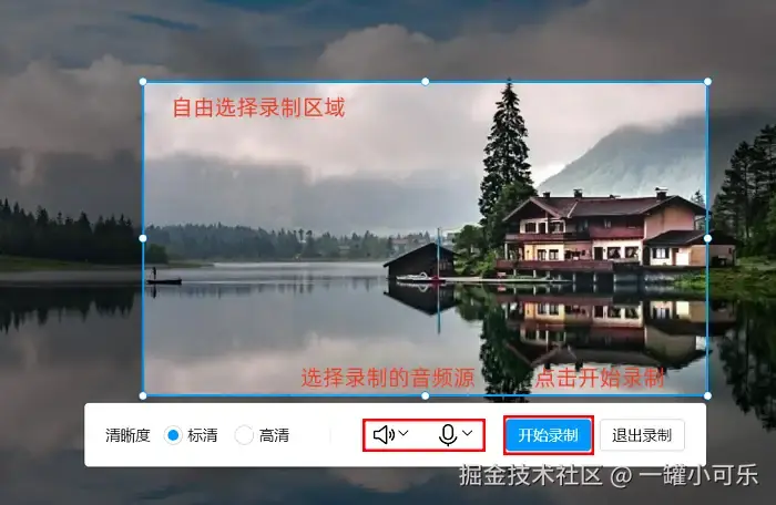 步骤2:当你点击 “屏幕录制” 后,屏幕上会出现一个录制框。你可以根据自己的需要,通过拖动录制框的边缘来调整录制区域的大小。QQ电脑怎样录屏带声音?你可以在工具栏中选择音频源。把录制区域和音频源都设置好之后,点击录制框上的 “开始录制” 按钮开始录制视频。