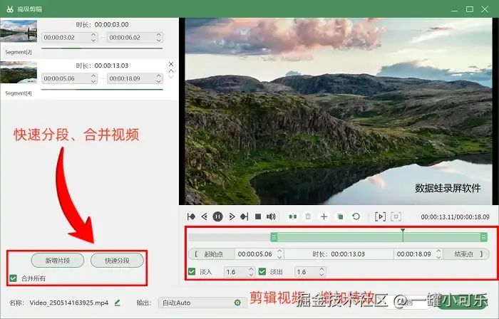 步骤3:当你录制结束后,数据 蛙录屏软件会自动弹出录制好的视频预览窗口。在这个预览窗口中,你可以播放视频,检查录制的效果。另外,数据 蛙录屏软件还自带了一些简单的视频编辑功能,就在 “高级剪辑” 页面。在这里可以裁剪视频的长度、合并多个视频片段、给视频增加特效等。