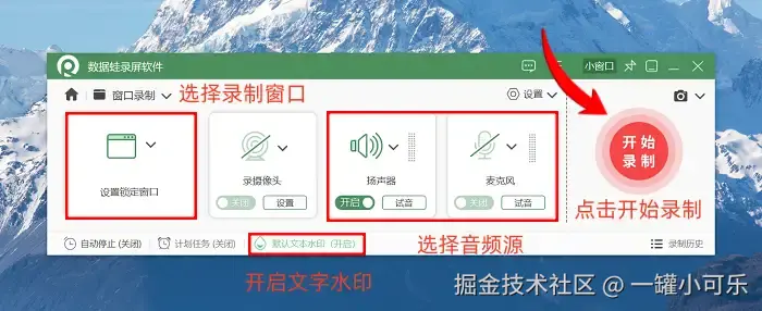 步骤2:进入屏幕录制设置界面后,你可以根据自己的需求选择录制窗口。你还可以根据录制的内容选择不同的音频源。我们还可以开启 “文字水印” ,能够较好地保护视频版权。全部设置好了之后,就可以点击 “开始录制” 按钮录制视频了。