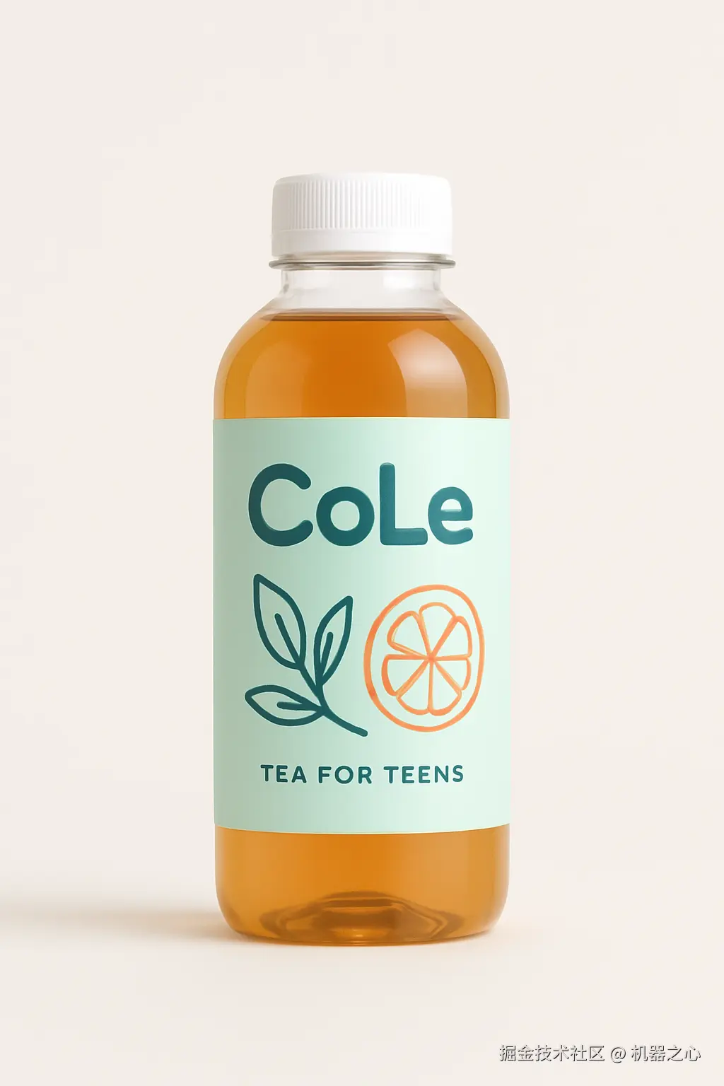 细细研究下来,我们发现这张图还蛮符合要求的:瓶身带有 CoLe 品牌名,下方有「TEA FOR TEENS」的字样,表明这款饮料是专为青少年设计的茶饮料。瓶身配色为浅绿色和橙色,给人一种清新、活力的感觉。还有一片叶子和一片橙子的图案,这可能暗示了饮料的口味或成分等。