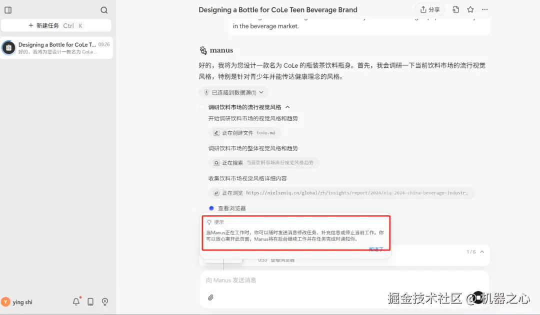 其实,在 Manus 工作过程中,你可以随时发送修改任务,补充信息、或者叫停当前工作。你也可以放心的离开此页面,Manus 工作完成后会通知你。