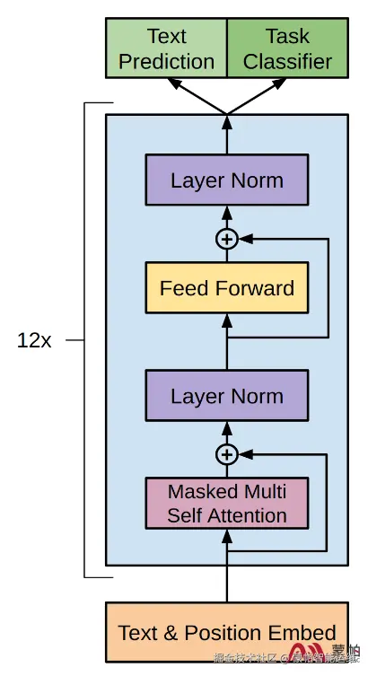 GPT-1采用了Transformer的解码器部分。Transformer模型由编码器和解码器组成,GPT-1只使用了解码器。这一解码器由多个相同的层堆叠而成,每一层都包含两个主要部分: