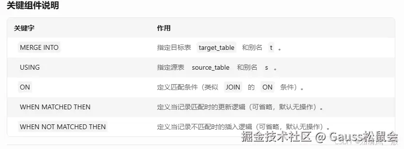 GaussDB 的 MERGE INTO 语法与标准 SQL 及 Oracle 类似,但需注意其分布式特性对语法的影响: