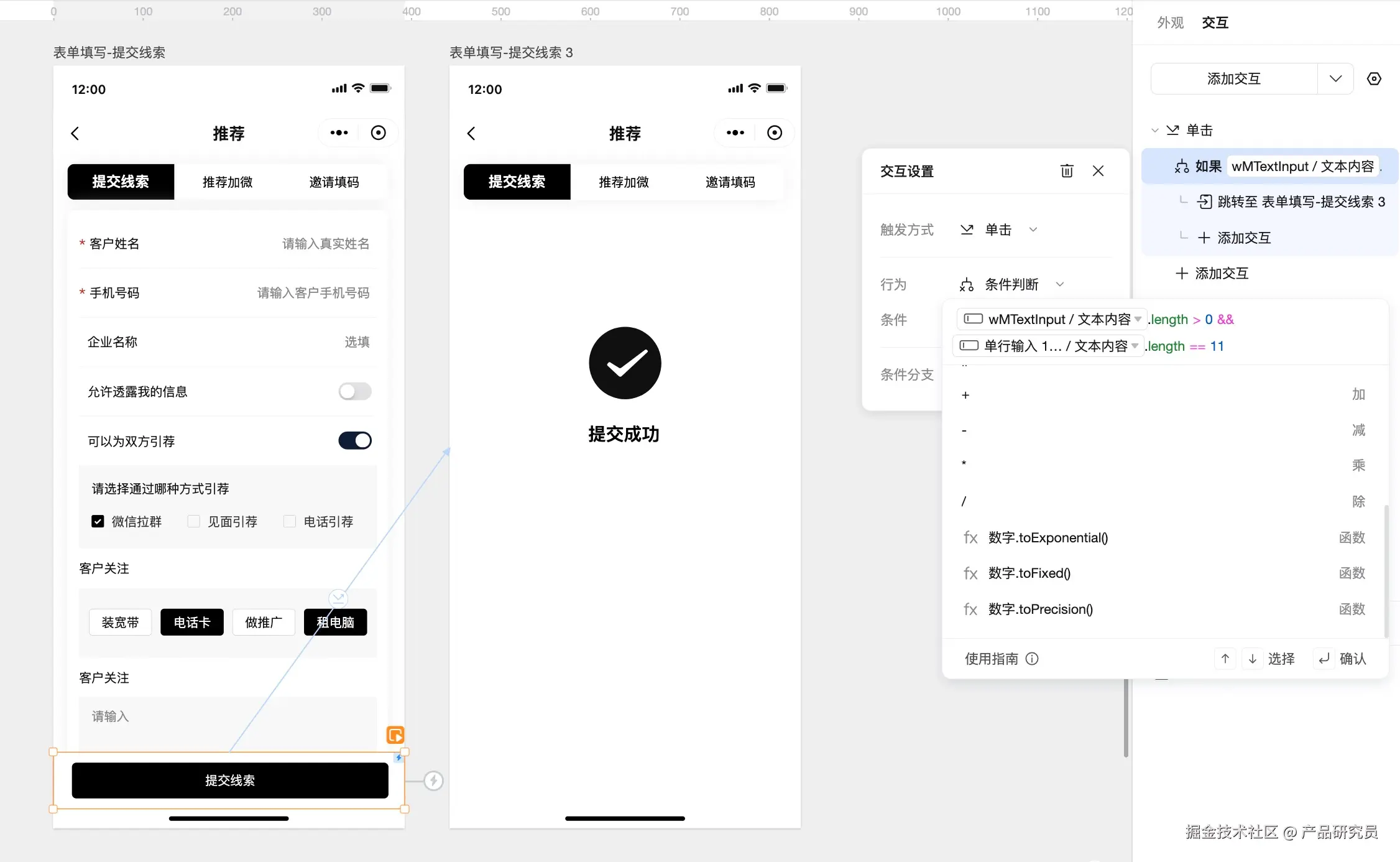 案例场景:以某APP「提交客户线索」表单页面为例,要求“客户姓名”与“手机号码”为必填项,不能为空且手机号位数为11位,才可以成功提交线索跳转页面。通过墨刀函数公式加上条件逻辑,即可在原型演示阶段模拟真实填写校验。