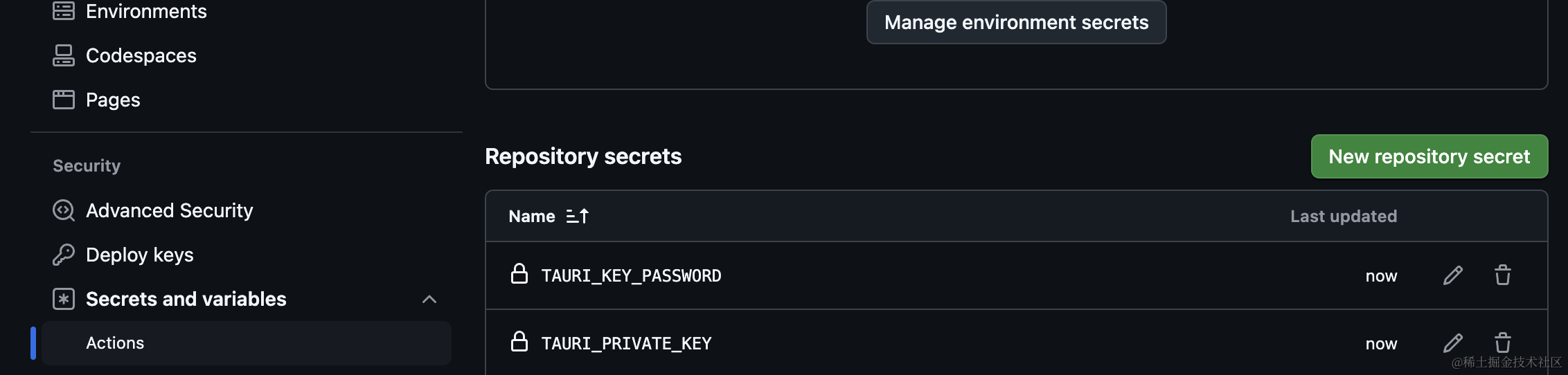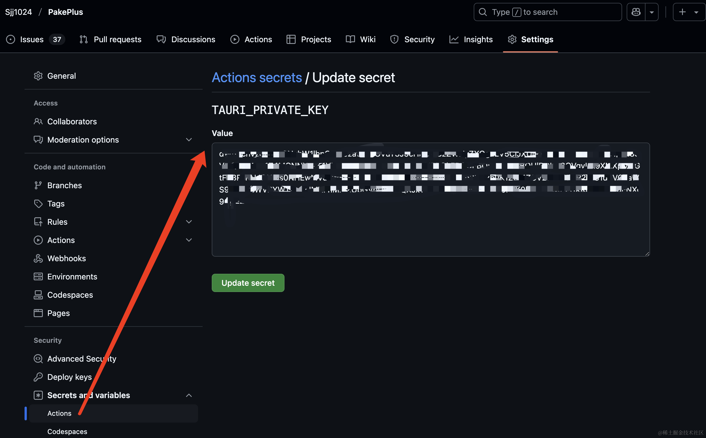 首先需要将第三步生成的私钥和密码配置到GitHub action secret中