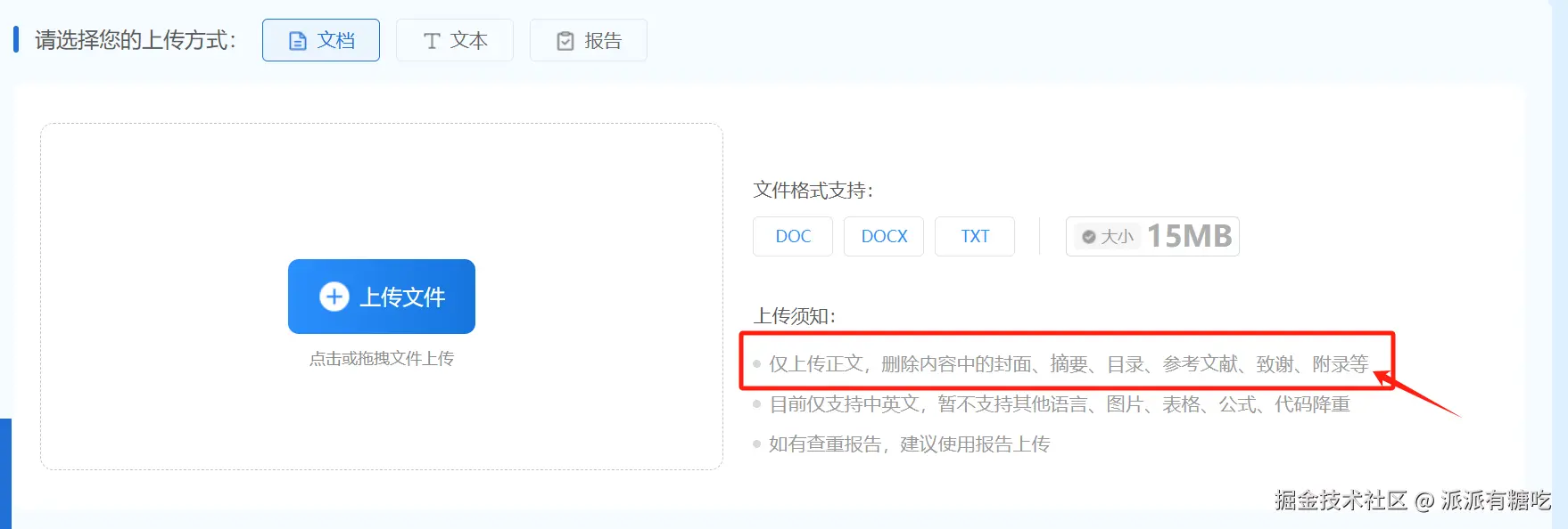 有些同学我想选择文档或文本形式全篇降重,应该不会有什么问题了吧?其实,对于那些不喜欢仔细阅读规则的小伙伴来说,也是有一个隐藏坑。选择文档或文本上传时一定要注意:只传正文!只传正文!只传正文! 摘要、目录、参考文献这些统统删掉!