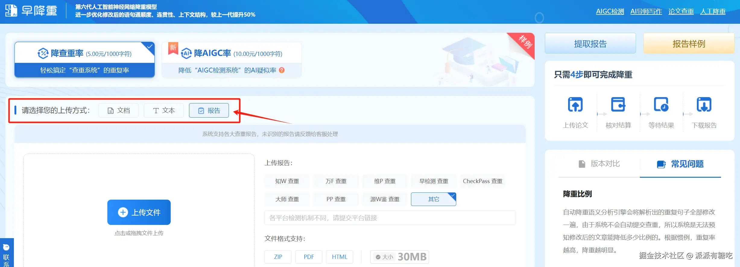 万万没想到上传方式的不同,也是影响降重费用的一个重要因素。早降重 zjchong.check110.com 系统为例,无论是降查重率或降AIGC率,选择上传方式都有文本、文档及报告三种。