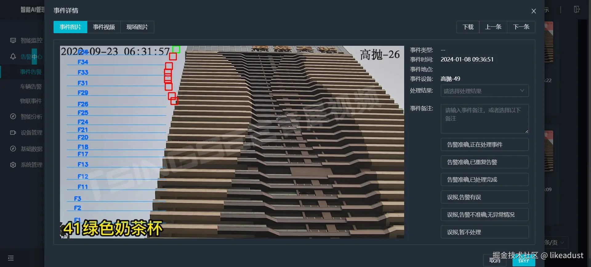 5)实时监测与告警:接入高空抛物检测摄像头后,智能分析网关V4可实时接收摄像机发来的告警数据。一旦摄像头检测到高空抛物行为,系统会立即触发告警机制,通知物业管理人员,以便及时采取措施。