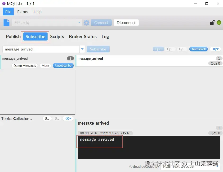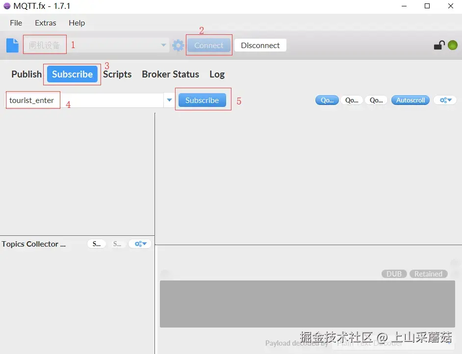 选择刚刚添加的配置文件“闸机设备”,点击"Connect"连接服务器。点击“Subscribe”,设置一个Topic(例如tourist_enter),点击Topic右侧的“Subscribe”进行消息订阅。如下图: