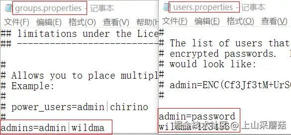 之后会在bin目录下生成mybroker文件夹,其中mybroker文件夹下的etc\apollo.xml文件下是配置服务器信息的文件,etc\users.properties文件包含连接MQTT服务器时用到的用户名和密码,注意这里只能修改密码(发现很多博客在没有验证的情况下就说用户名和密码都在这里修改),如果要修改用户名需要到etc\groups.properties文件下去修改。etc\groups.properties文件下的用户名与etc\users.properties文件下的密码是一一对应的,如下表示一个组中配置了两个用户分别是admin与wildma,然后这两个用户名对应的密码分别是password与123456