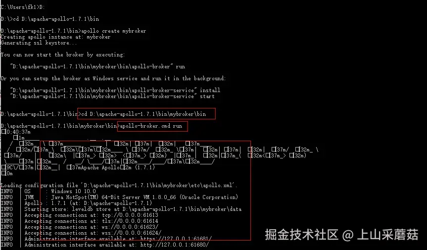 命令行进入解压文件的bin目录下(例如:cd D:\apache-apollo-1.7.1\bin),然后输入apollo create mybroker(其中mybroker为自定义的服务器名称)创建服务器实例。具体如下图: