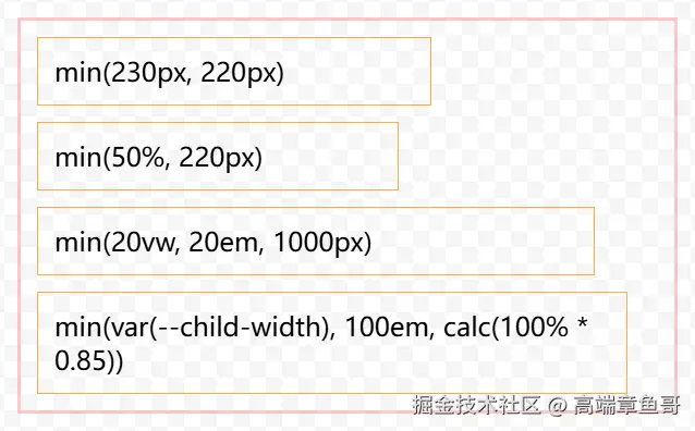 min() 用于获取一组数值中的最小值。通常用于比较不同单位之间的最小值,比如 min(400px, 50%, 20em, 10vw)