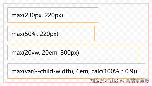 <div class="child">max(var(--child-width), 6em, calc(100% * 0.9))</div>