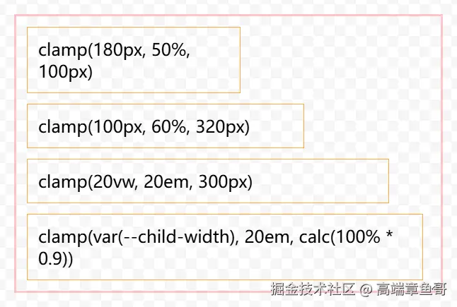 可以看到上面例子中,clamp 函数可以嵌套 min、calc、max 函数,calc 函数也可以可以嵌套使用 min 函数,max 函数也可以使用 calc 的计算结果。