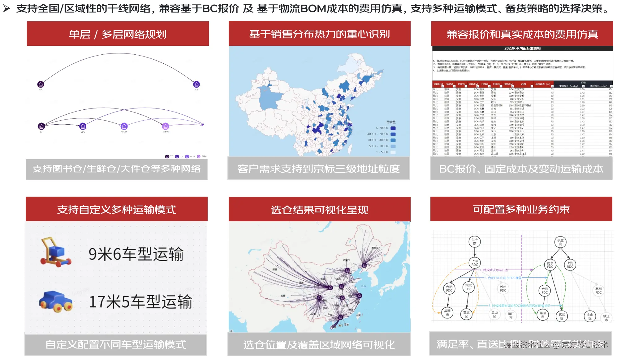 合理的供应链网络设计,能提升供应链效率,服务企业商业模式和竞争战略的目的。京东内外客户的供应链优化需求主要分为干线网络选址和前置仓网络选址两个场景。