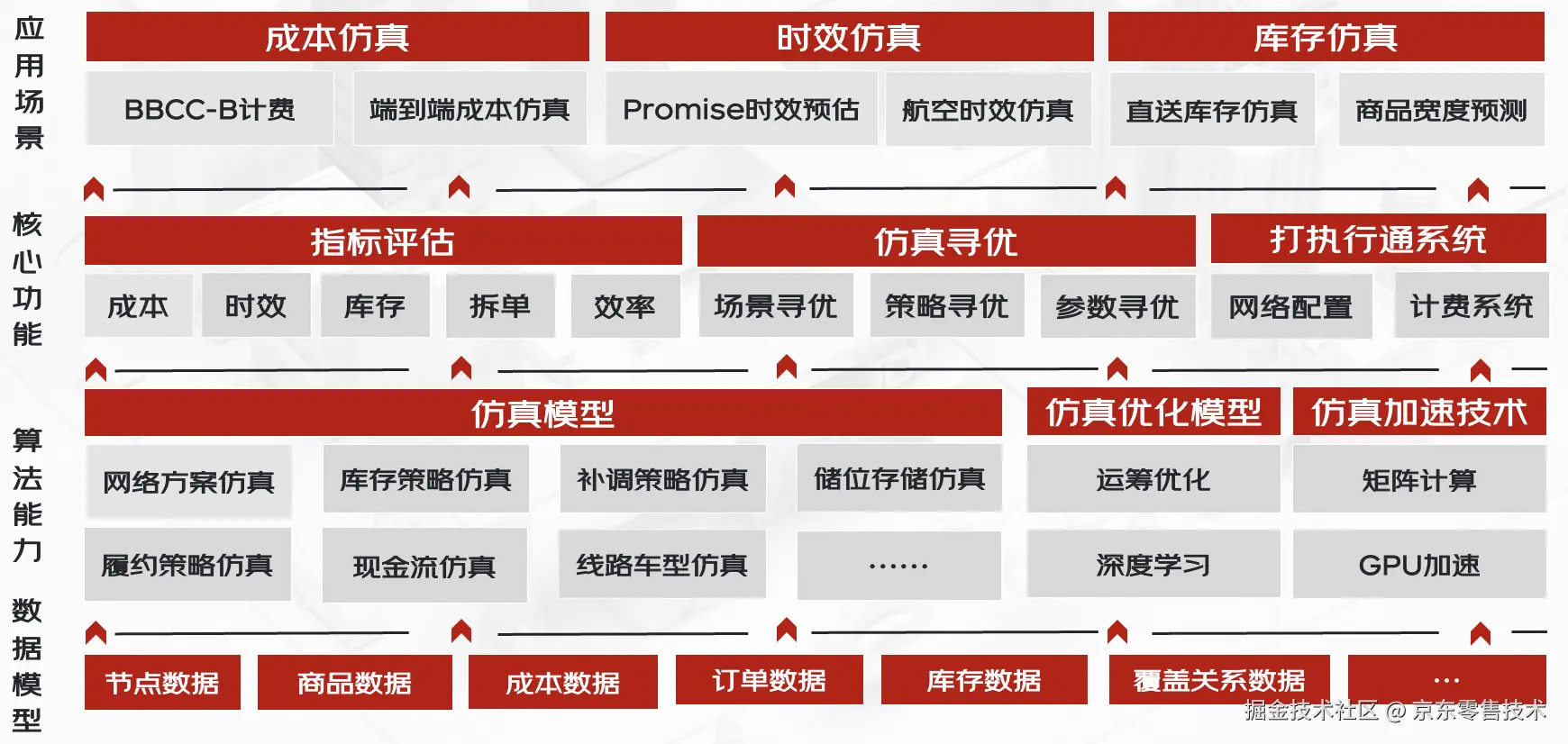 供应链仿真算法技术包含仿真模型构建、仿真方案寻优、仿真计算加速三个方向:建立通用的全链路仿真底层模型,以沙盒形式,组合网络结构、商品布局结构、库存策略和履约定位策略,搭建特定场景仿真,输出全局仿真结果;利用运筹优化和深度学习框架中的梯度下降算法,实现仿真方案组合、策略参数寻优;通过矩阵计算与GPU算力堆叠,对仿真计算加速可提升10-100倍。