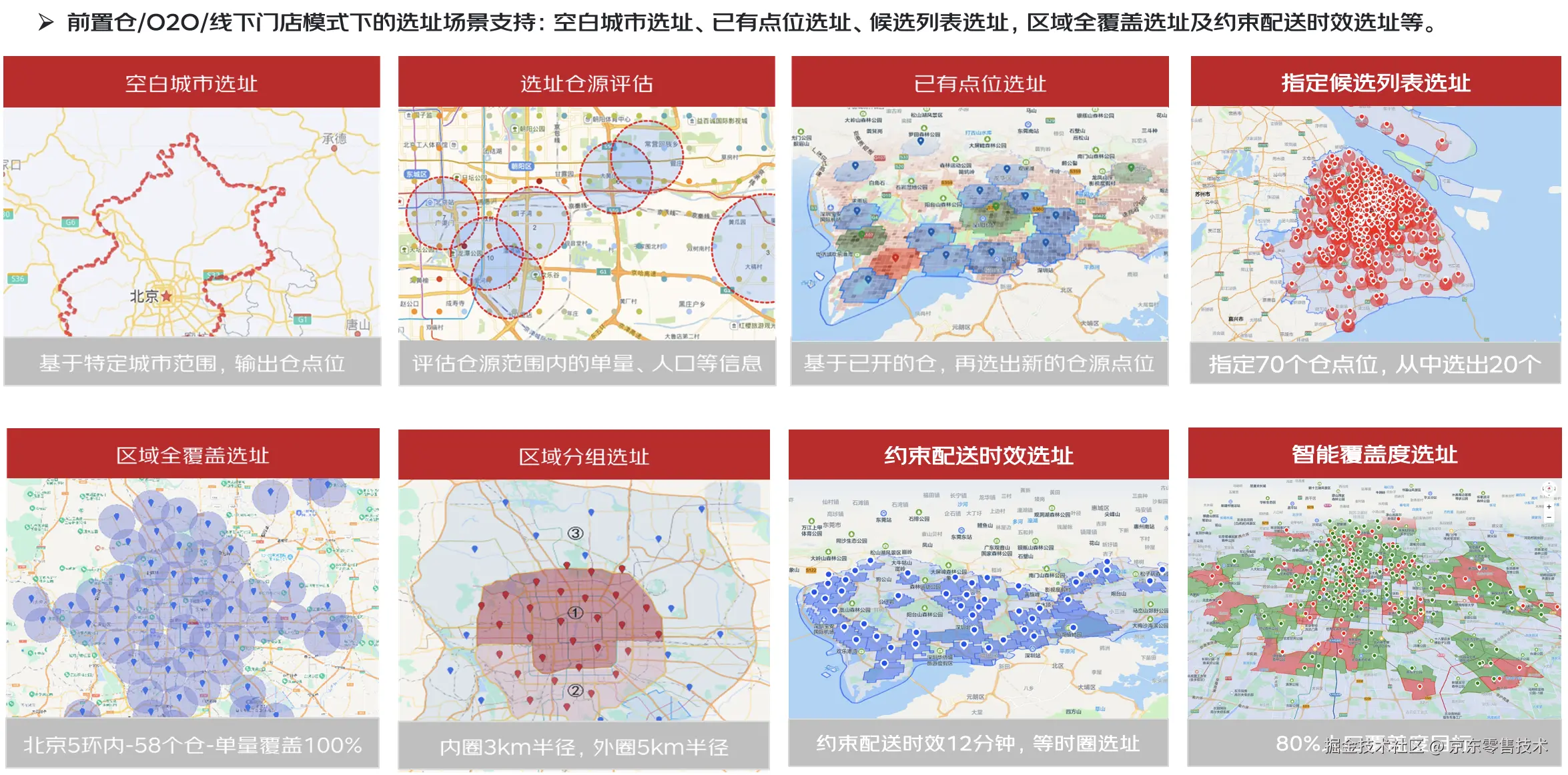 前置仓网络选址是单个城市内、近距离的单层网络规划,主要服务即时零售前置仓、线下零售、线下服务的选址规划场景,在城市内通过前置仓/线下门店,实现更近距离、更快时效地触达消费者。当前实现京东内部即时零售、线下零售场景100%覆盖。