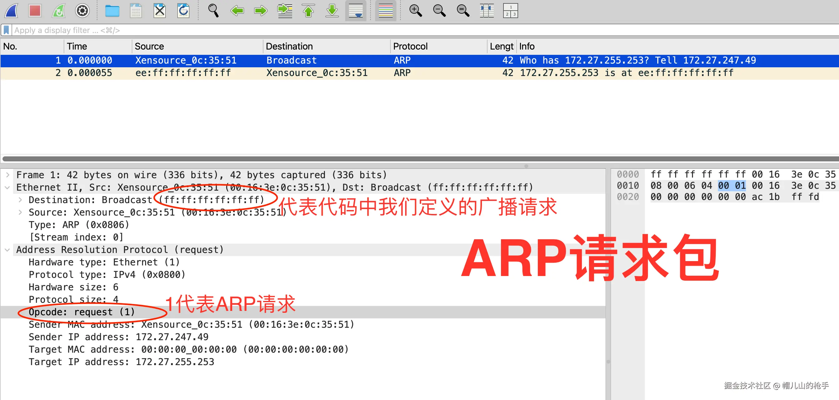 此处Destination: 全是f,是我们代码在封装Ethernet报文头时定义的广播包;Opcode: 代表封装ARP报文是作为ARP请求的方式去封装的ARP报文。
