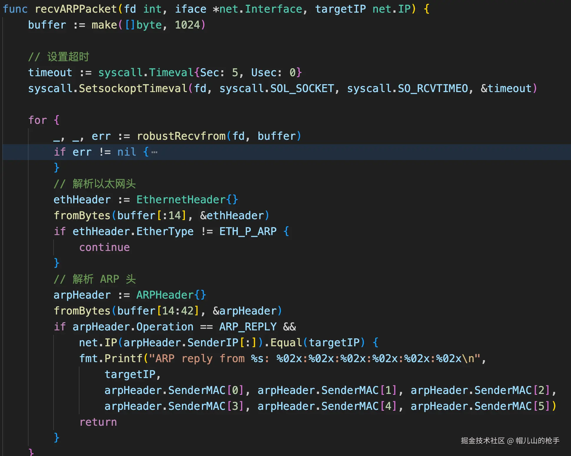 Ethernet II以太帧报文、ARP报文,将目标IP地址封装至ARP包中,组包完成后发送ARP请求数据包; - 最后根据绑定二层网络的socket描述符,接收ARP应答包,并进行解析最终拿到MAC地址。