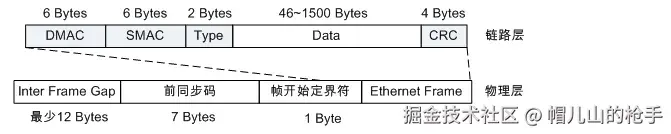 | Data | 46~1500字节 | 数据字段,标识帧的负载(可能包含填充位)。 数据字段的最小长度必须为46字节以保证帧长至少为64字节,这意味着传输1字节信息也必须使用46字节的数据字段。 如果填入该字段的信息少于46字节,该字段的其余部分也必须进行填充。数据字段的最大长度为1500字节。 以太帧的长度必须为整数字节,因此帧的负载长度不足整数字节,需插入填充字段以保证数据帧的长度为整数字节。 |