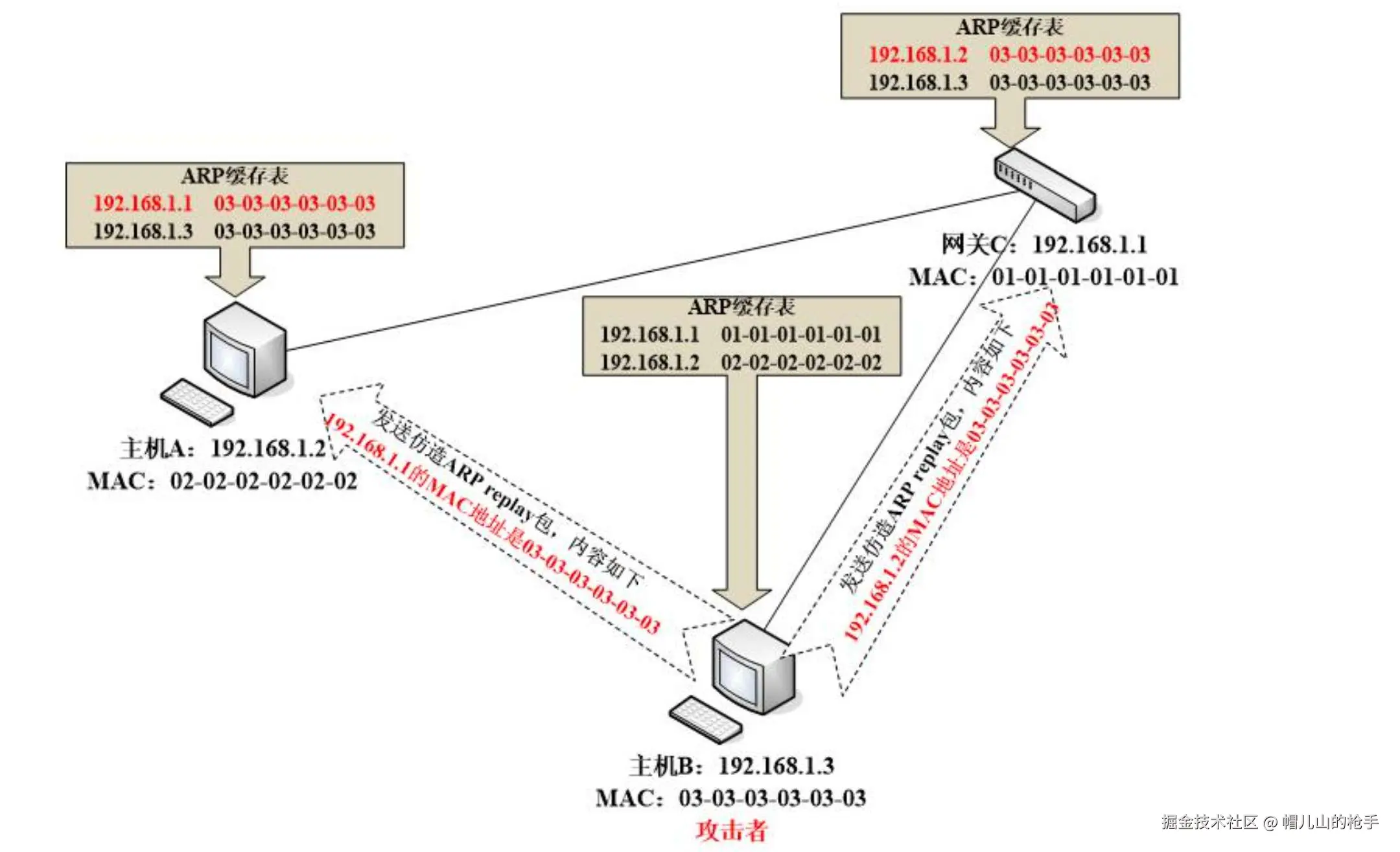 - 局域网内的设备接收到伪造的 ARP 响应后,更新其 ARP 缓存,将目标 IP 地址错误地映射到攻击者的 MAC 地址。