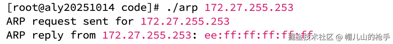 下面看下效果,代码通过go编译后,执行arp命令参数是目标IP