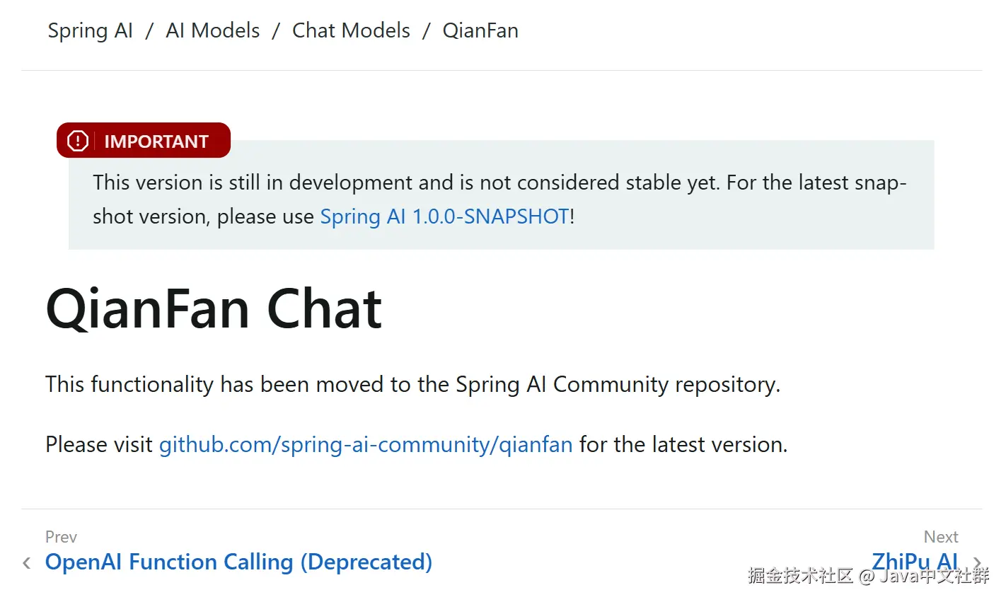 和国内开发者关系比较大的一个更新就是 Spring AI RC1 移除了百度的千帆大模型,给出的原因是中国境外无法访问,所以被移除了,官方文档中千帆的对接文档也被删除了,变成这个样子了: