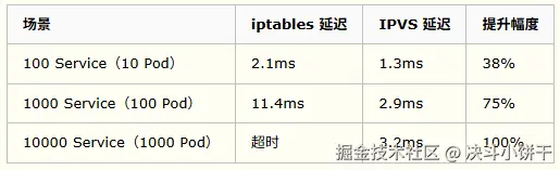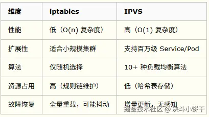 iptables 和 IPVS 都是基于内核的 Netfilter 实现。iptables 基于 iptables 表匹配规则,复杂度为 O(n),IPVS 基于哈希表实现规则匹配,复杂度为 O(1)。详细对比如下: