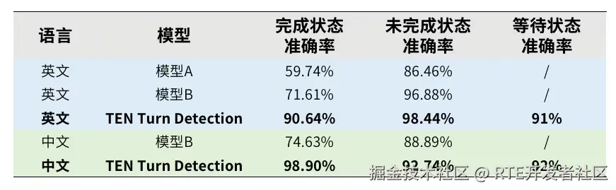 我们在多场景测试数据集上对比了 TEN Turn Detection 和其他同类开源模型,各模型的表现如下: