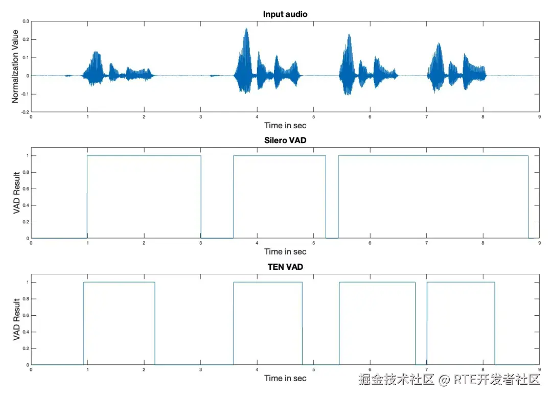 在延迟方面 TEN VAD 同样领先。它能快速检测语音与非语音之间的切换,而 Silero VAD 则存在数百毫秒的延迟,导致人机交互系统的端到端延迟和打断延迟增加。