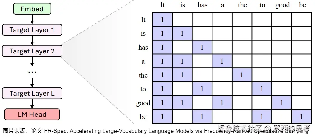 投机采样(Speculative Sampling)使用一个较小的草稿模型快速生成多个 token,然后使用原始的目标 LLM 并行验证这些 token。其缺点是需要合适的草稿模型,并且草稿模型的质量直接影响加速效果。